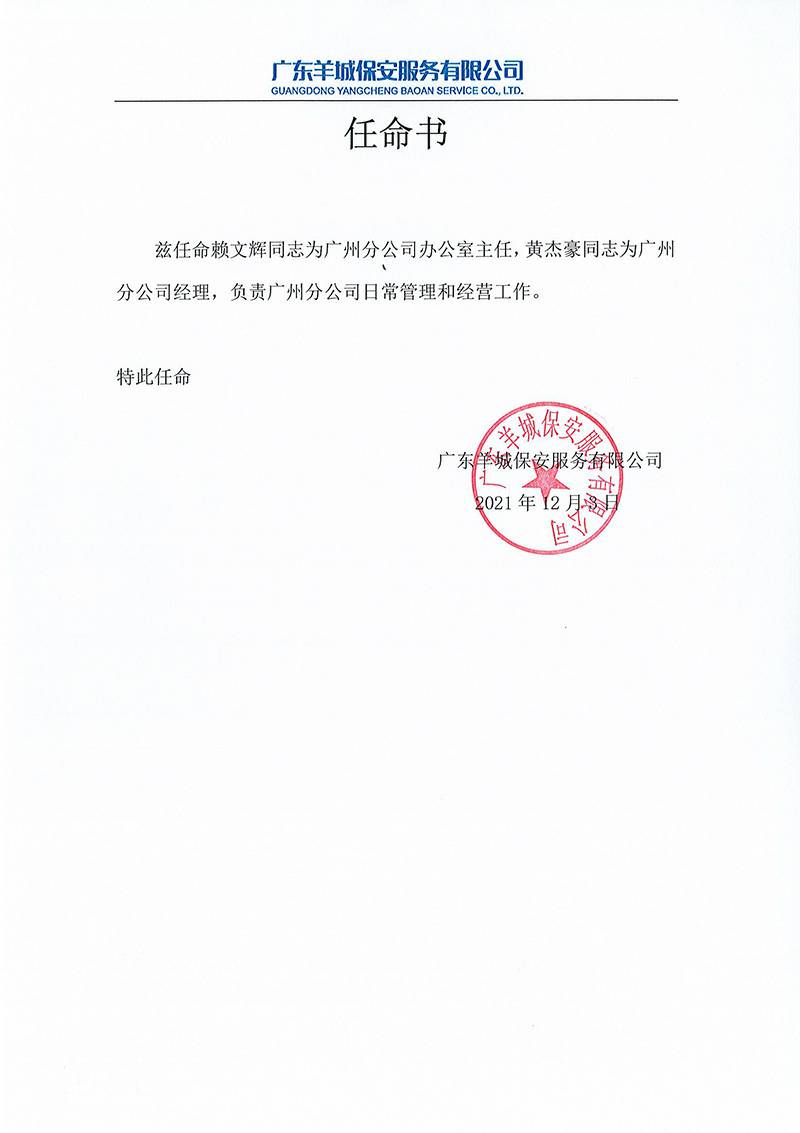 珠海昊弘器材租赁有限公司关于黄杰豪与赖文辉的任命书正式通知